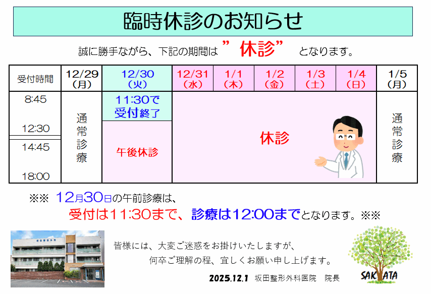 - 9月5日(金)の診察(1日)は、坂田院長休診のため、沖田医師(岡山済生会外来センター病院 整形外科)の代診となります。 9月6日(土)の午前診察は、坂田院長休診のため、杉本医師の代診となります。 また藤原医師の診察に変更はありません。 何卒よろしくお願い申し上げます。