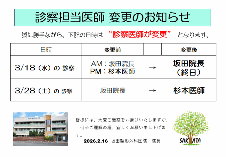 - 3月22日(金)の午後の診察は、 坂田院長から杉本医師に変更となります。
